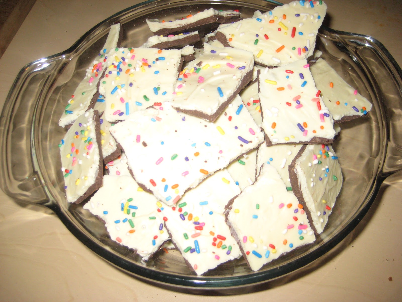 I used melting chocolate wafers. With these, once the dark chocolate layer is melted and spread out onto the pan, work quickly with the white chocolate. If you let the dark chocolate harden all the way (or put it in the freezer), then the white chocolate won't adhere to it. I also learned, however, that if you do it too quickly, the chocolates mix together and you get mottled bark. It's a delicate balance.